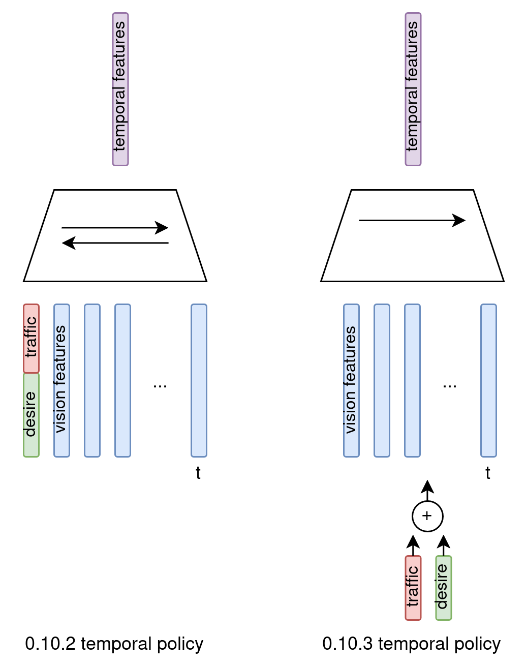 We changed the encoding of the Vision Features, Desire Signal (lane changes, turns, etc.), and Traffic Convention (left-hand drive vs right-hand drive) from a fixed-length non-causal attention layer to a variable-length causal attention layer. While this does not change the behavior of the current training stack, it opens up the possibility to train with variable temporal lengths and makes more sense from an architectural point of view.
